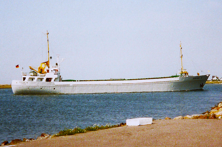 Juli 1992: MS KARINA W ausgehend Heiligenhafen in Höhe Mole