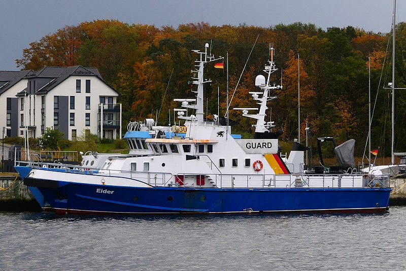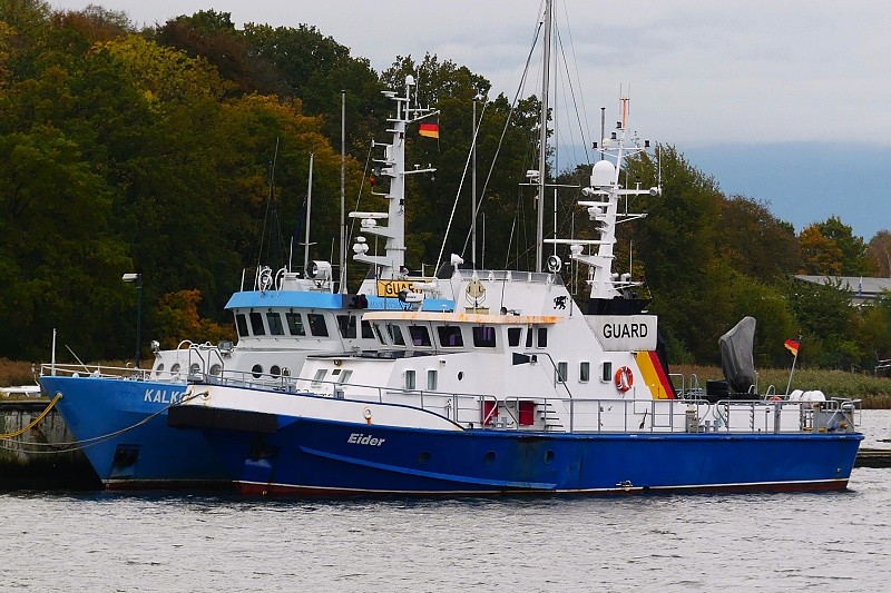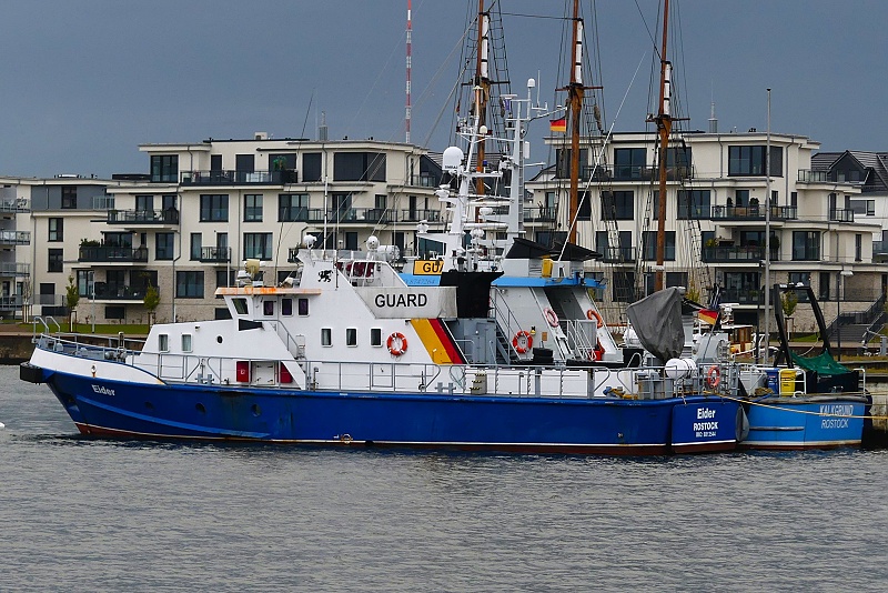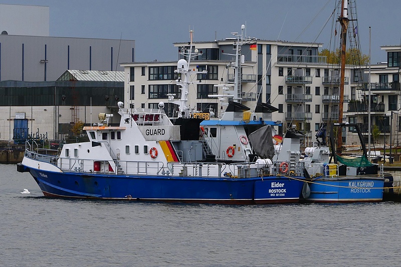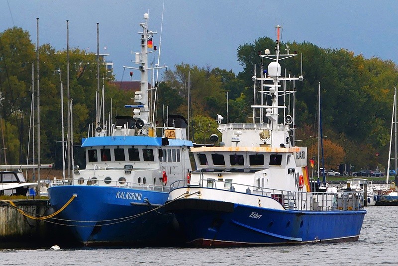 21.10.2025: Serviceschiffe MS KALKGRUND (ehemaliges Zollboot) und MS EIDER (ehemaliges Polizeistreifenboot) der Offshore und Marineservice Rostock UG & Co. KG an ihrem Liegeplatz auf der Unterwarnow in Rostock-Gehlsdorf: