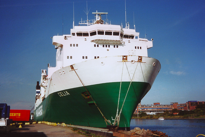 Oktober 1994: MS CELIA unter Entlöschung am Nordlandkai Anl. 4…das 1979 auf der MITSUI ICHIHARA ENGINEERING & SHIPBUILDING als VASALAND gebaute Schiff hat eine namensreiche Karriere hinter sich…von 1986 bis 1996 fuhr es als CELIA unter finnischer Flagge für Finncarriers…unter seinem letzten Namen MS MASTER (ab 2013) ging es im Jahr 2014 zum Abwracken nach Indien: