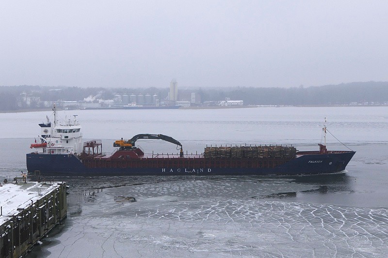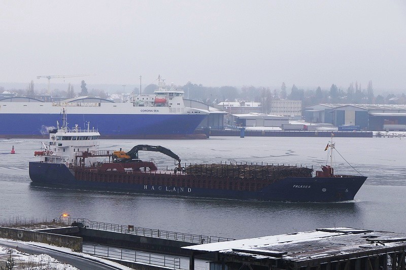 Eineinhalb Stunden später folgte die MS FALKSEA ebenfalls mit Rundholz zum Konstinkai: