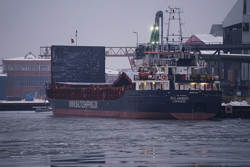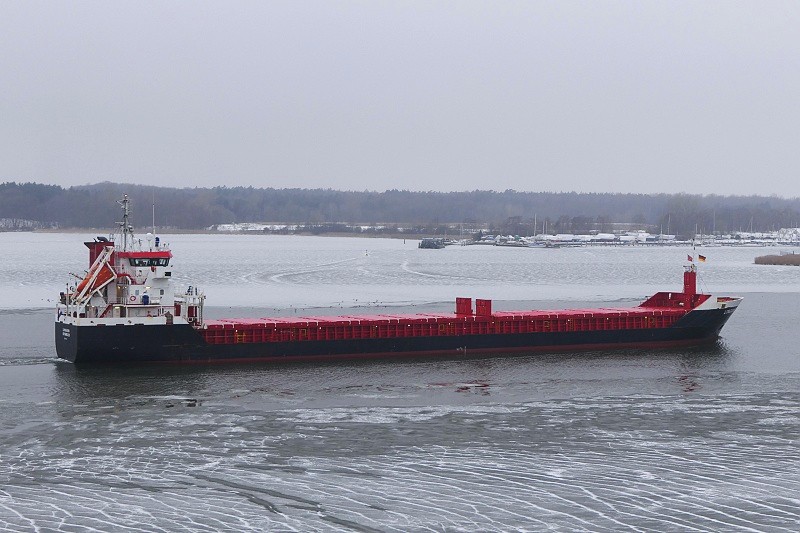 - MS RIX AMBER ( 5BKQ4, Cyprus, 88 m, IMO 9171101 ) am Lagerhaus Lübeck