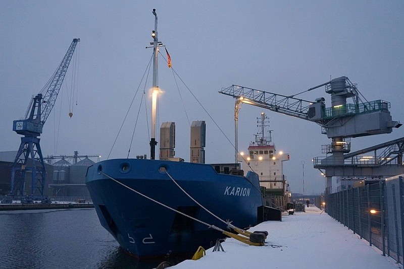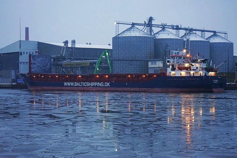 Am Lagerhaus Lübeck lag die MS RIX AMBER bei Sonnenuntergang mit einer Ladung Dünger unter Entlöschung:
