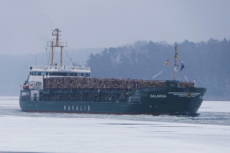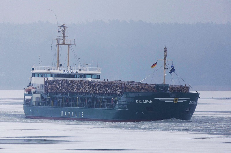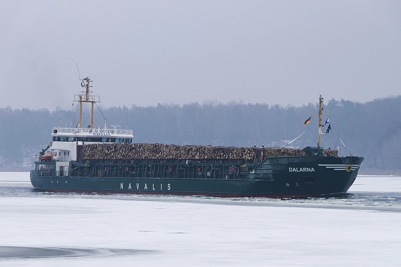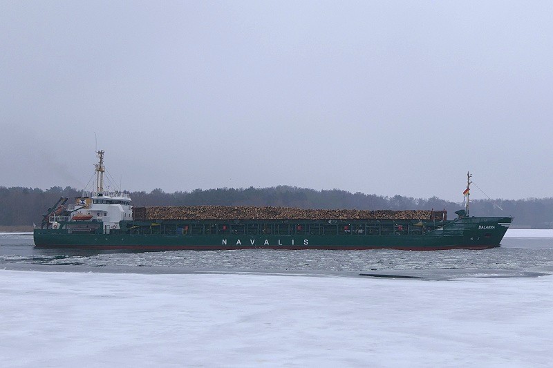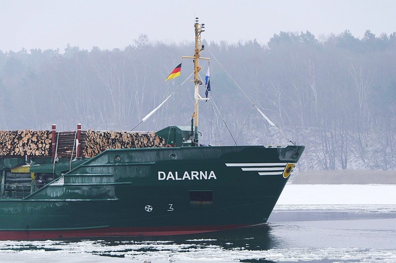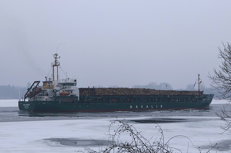Gegen Mittag dann lief die MS DALARNA mit ihrer Ladung Rundholz nach Lübeck ein und passierte Herrenwyk auf dem Weg zum Konstinkai: