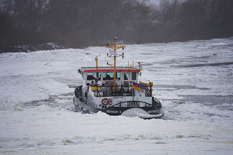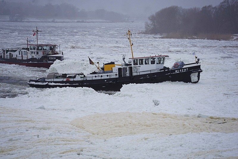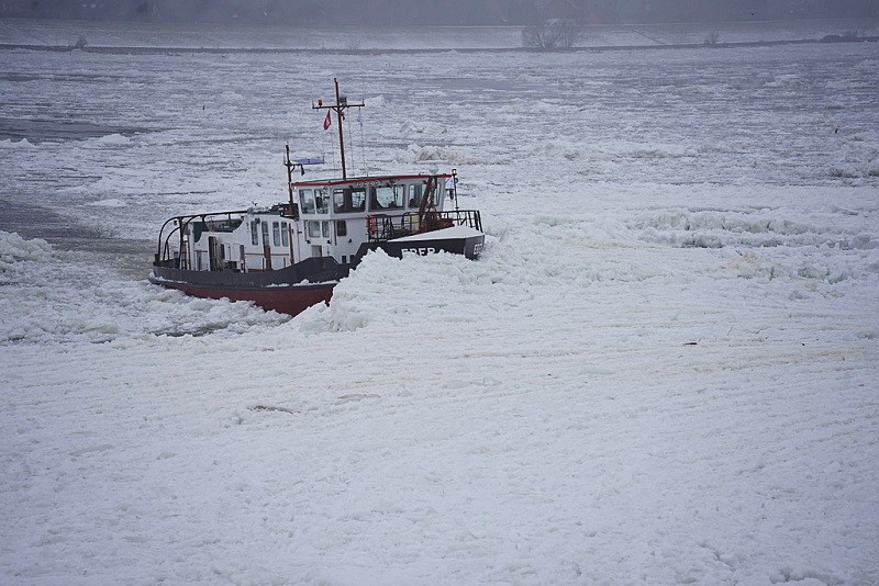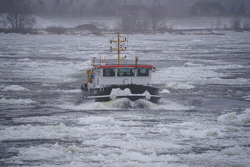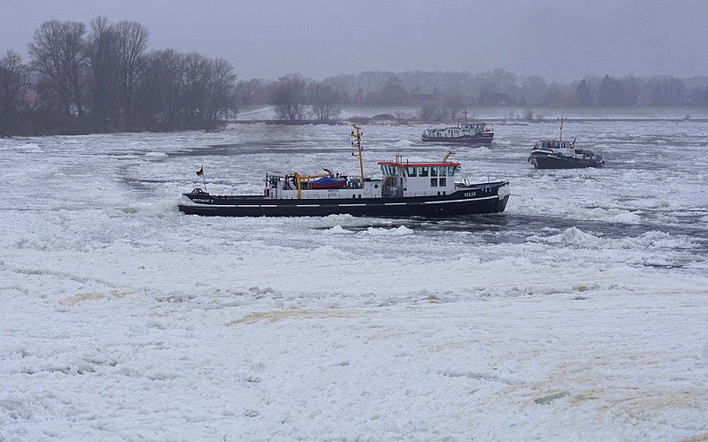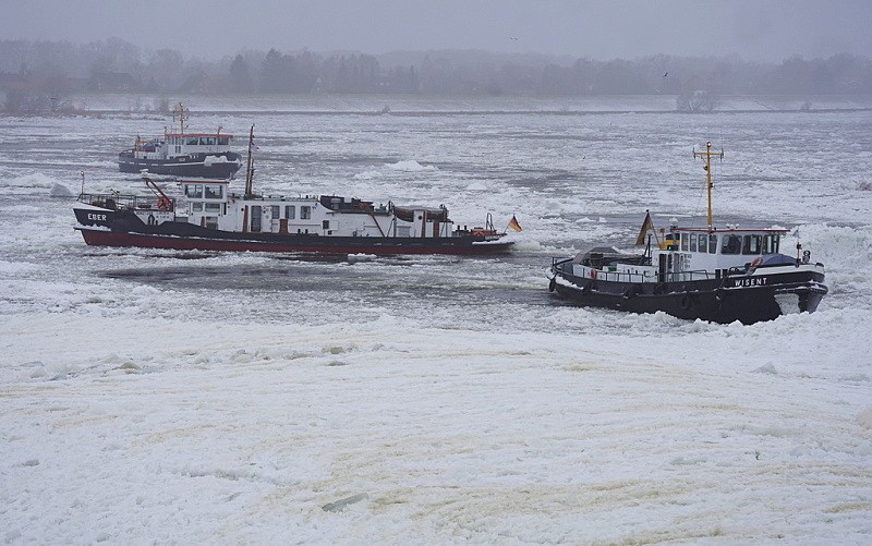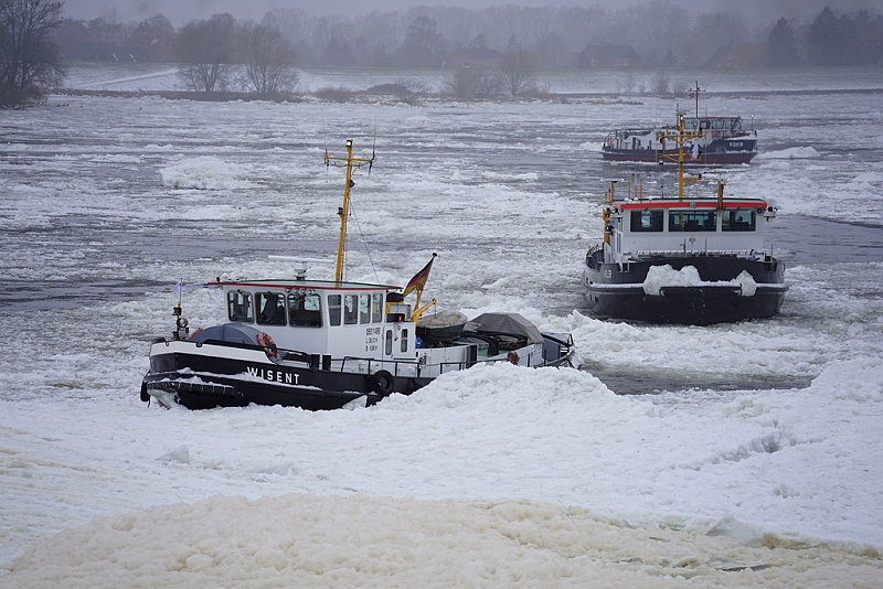 Und nun wieder ein Blick nach Geesthacht zur Elbe…dort waren auch heute weiterhin die Schlepper MS EBER, MS WISENT und MS KEILER im unermüdlichen Einsatz gegen den Eisgang…: