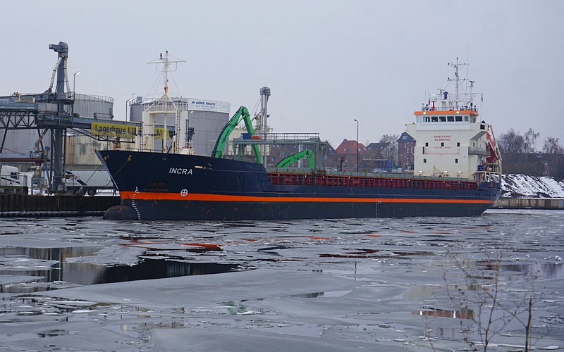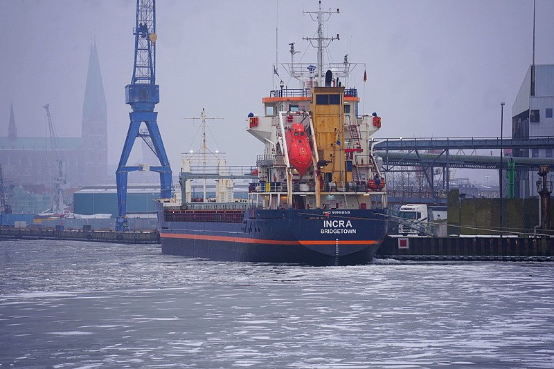 - MS INCRA ( 8PAL8, Barbados, 95 m, IMO 9195858 ) am Lagerhaus Lübeck