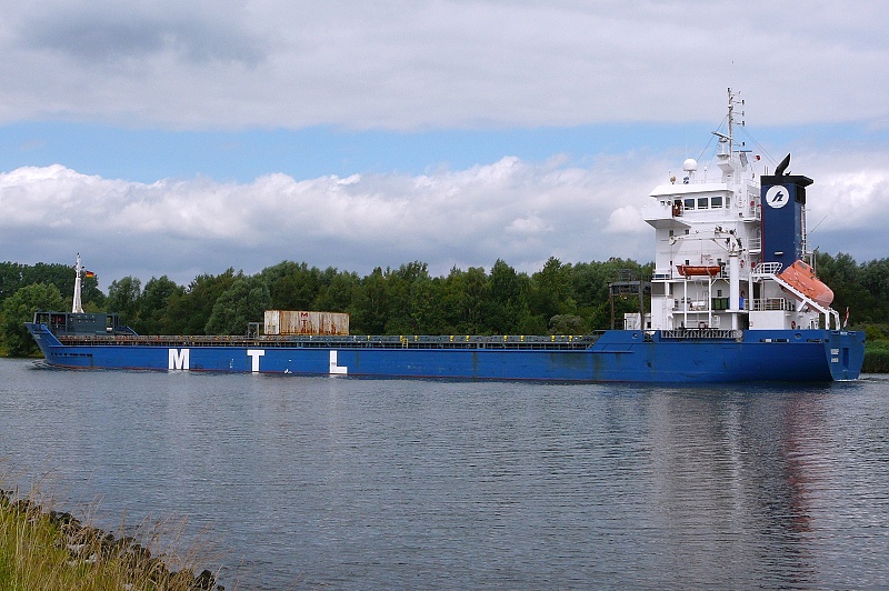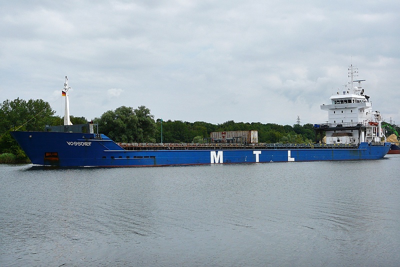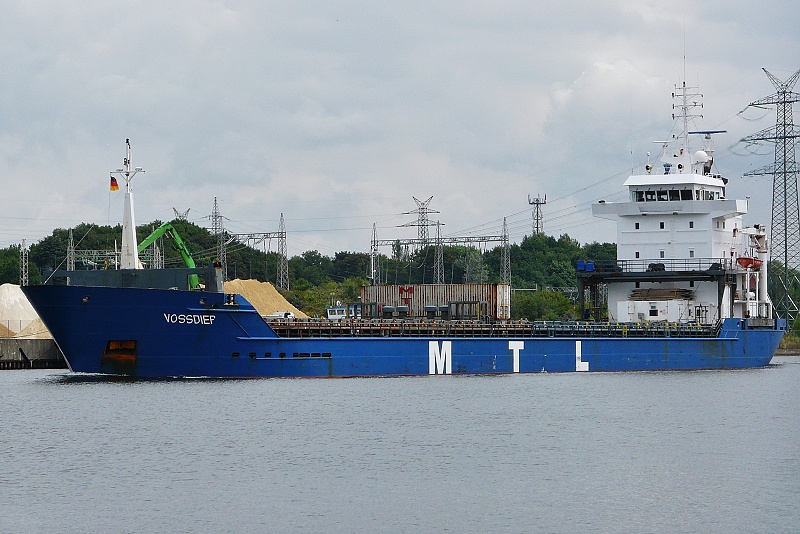 Seit Dienstagnachmittag liegt die MS JULIE mit einer Ladung Splitt im Vorwerker Hafen…hier noch als MS VOSSDIEP am 16.07.2014 beim Eingang Höhe Gothmund: