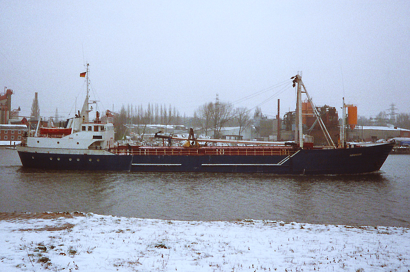 Januar 1994: MS SONNODD ausgehend in Höhe Schlutup…das 1967 auf der NEUE RUHRORTER SCHIFFSWERFT – DUISBURG als HARUN gebaute Schiff fuhr ab 1985 als SONNODD unter norwegischer Flagge…im November 1998 sank das Schiff einen Tag nach Maschinenausfall südlich von Grimstad…es gab den Todesfall des Eigners bei dieser Havarie zu beklagen…das Schiff ging insgesamt dreimal unter (1972 unter deutscher Flagge und 1988), wurde zweimal geborgen und wieder in Fahrt gebracht: