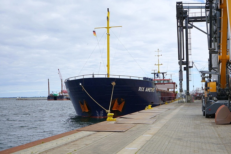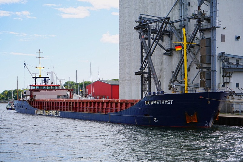 In Heiligenhafen lag die MS RIX AMETHYST nach Beladung für Hamburg auslaufbereit am Silo: