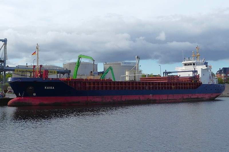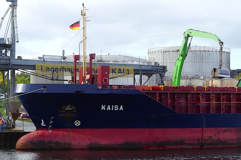 - MS KAISA ( V2RG8, Antigua and Barbuda, 90 m, IMO 9333462 ) am Lagerhaus Lübeck