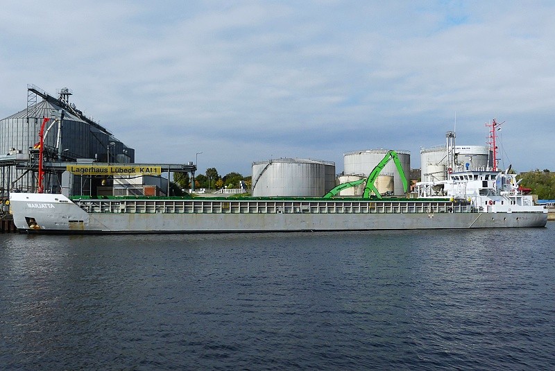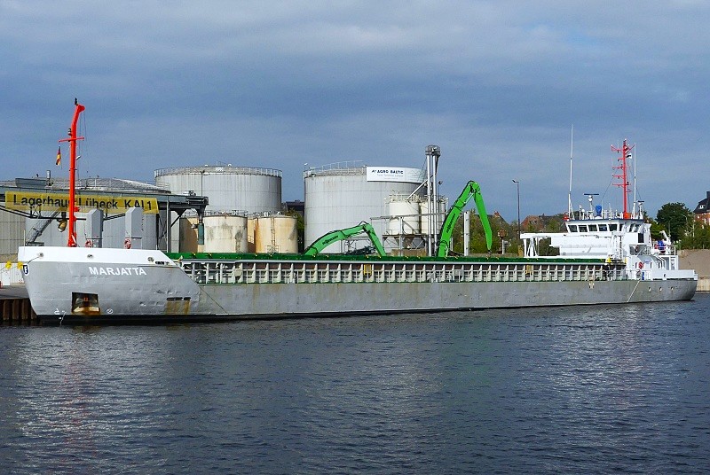 - MS MARJATTA ( 5BQU4, Cyprus, 83 m, IMO 9345374 ) am Lagerhaus Lübeck
